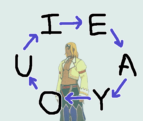 This chain is a bit harder to remember than the pairs because it lacks the phonetic link most of them have. You may know that the word you in English becomes oui in Al Bhed thanks to Hupiu Iasydci's song Oui Are Al Bhed, which I believe gained some popularity on the mainland. So that's three out of six vowels covered already. To remember the entire chain, you might like to use the common greeting hela du saad oui, meaning nice to meet you. That covers five of the six vowels, and for the sixth you can just work out that as there is no a in the English version of the phrase and no y in the Al Bhed, English a must become Al Bhed y.